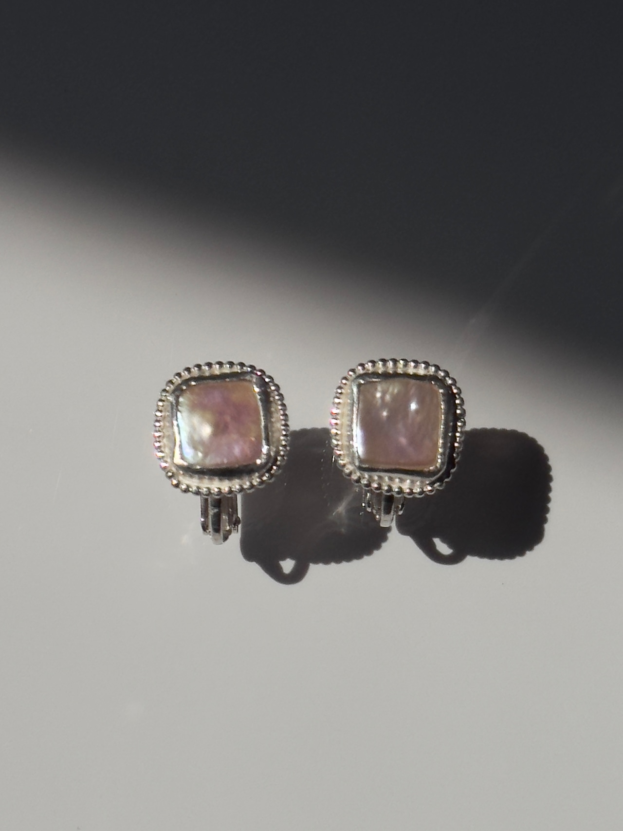 やわらかな角を残したスクエア型のあこやバロックパールを、繊細な粒状のシルバーで縁取り、クラシックかつ、モダンな印象に仕上げました。
