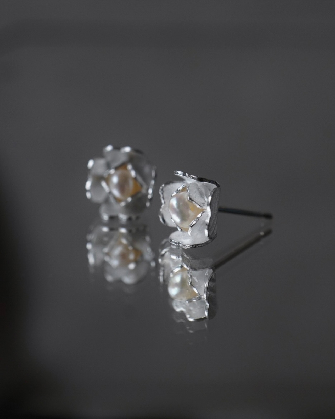 少し歪なかたちが愛らしいバロック淡水パールを、シルバーの花びらがやさしく包み込みます。